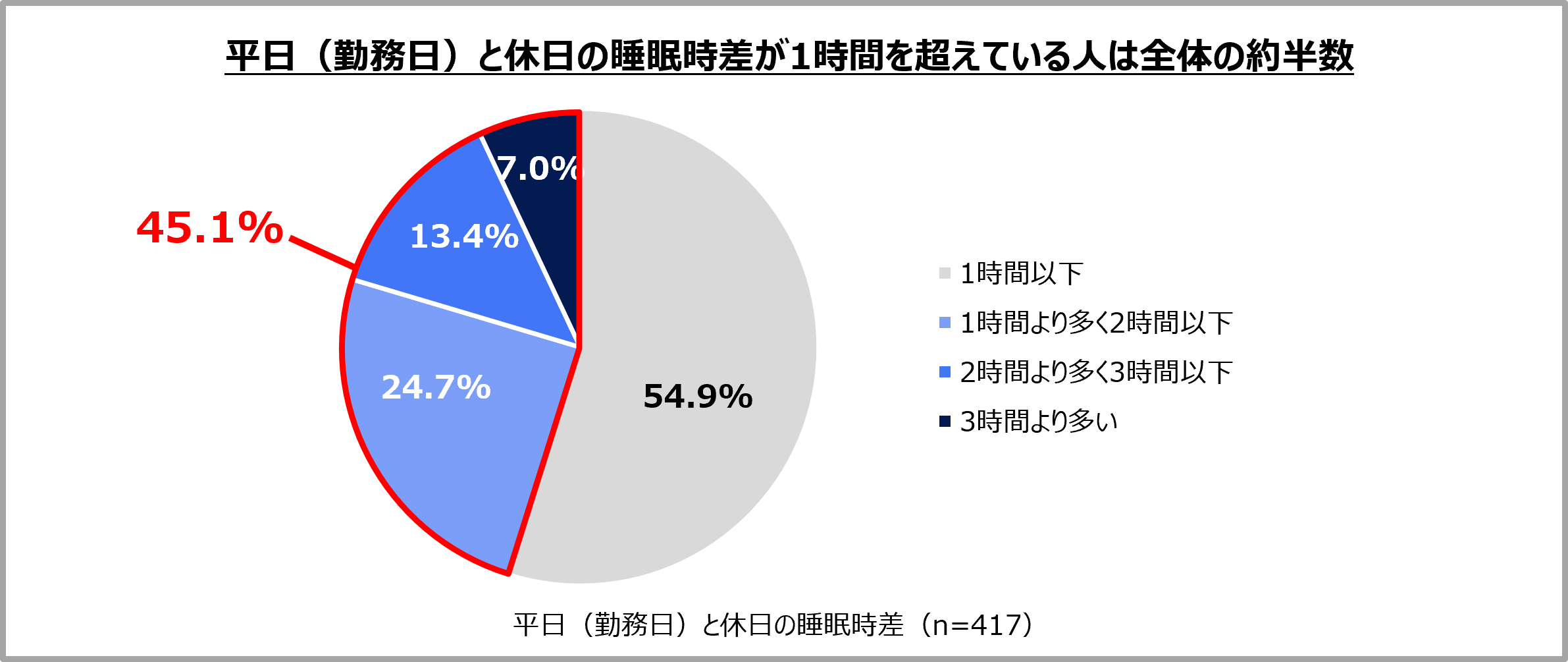 平日(勤務日)と休日の就寝時間および起床時間を聞き「睡眠時差」を算出したところ(※1)、全体平均は1.2時間(72分)であるのに対し、20代女性が最もズレが大きく、平均1.7時間(102分)の「睡眠時差」があることが分かりました。「睡眠時差」は1時間以内に収めることが理想とされていますが、1時間を超えている人は全体の約半数(45.1%)に上り、多くの人が時差ボケのような症状を感じている可能性があると考えられます。