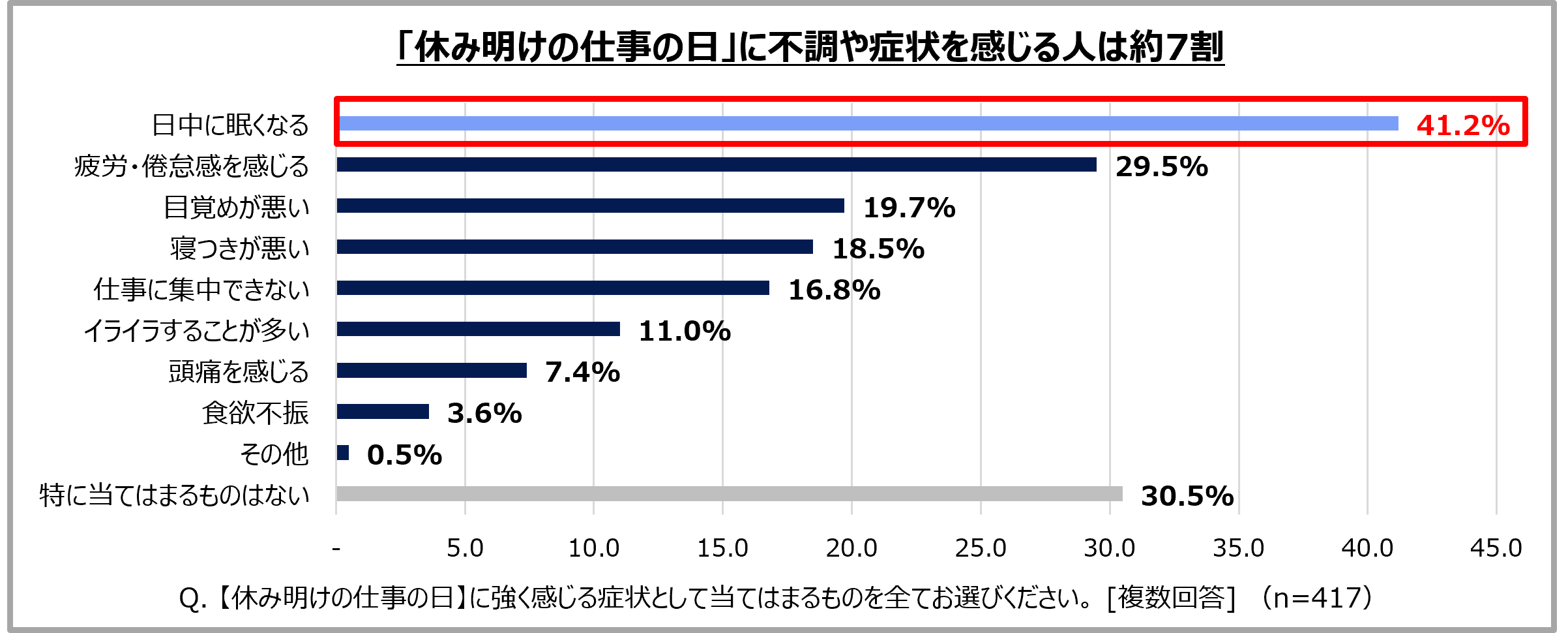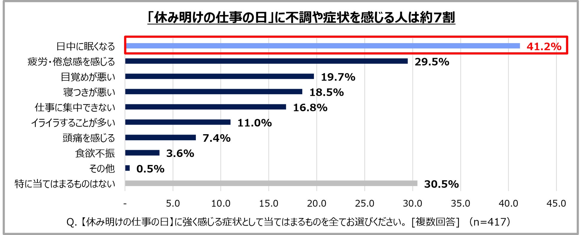「休み明けの仕事の日」に不調や症状を感じる人は約7割。特に「日中に眠くなる」人が約4割でトップ。