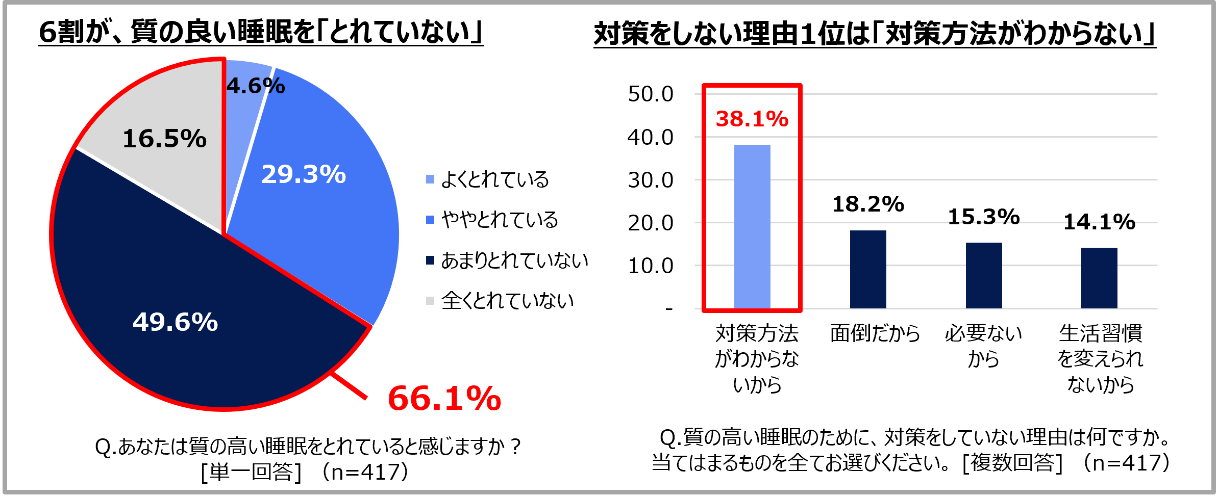 6割以上が「質の高い睡眠を取れていない」と実感するも、対策は3割以下にとどまる。