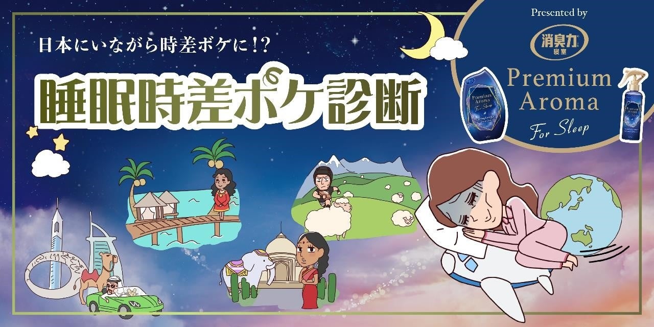 自身の「睡眠時差ボケ」度や睡眠ダメージレベル、睡眠NG習慣が簡単にわかる『睡眠時差ボケ診断』を、「消臭力 Premium Aroma For Sleep 寝室用」専用サイト内にて期間限定で公開いたします。週末の「睡眠時差ボケ」で、世界のどの国に行く程度の時差を感じているのかをチェックできるコンテンツです。是非楽しみながら、睡眠への気づき、睡眠環境の改善にお役立てください。