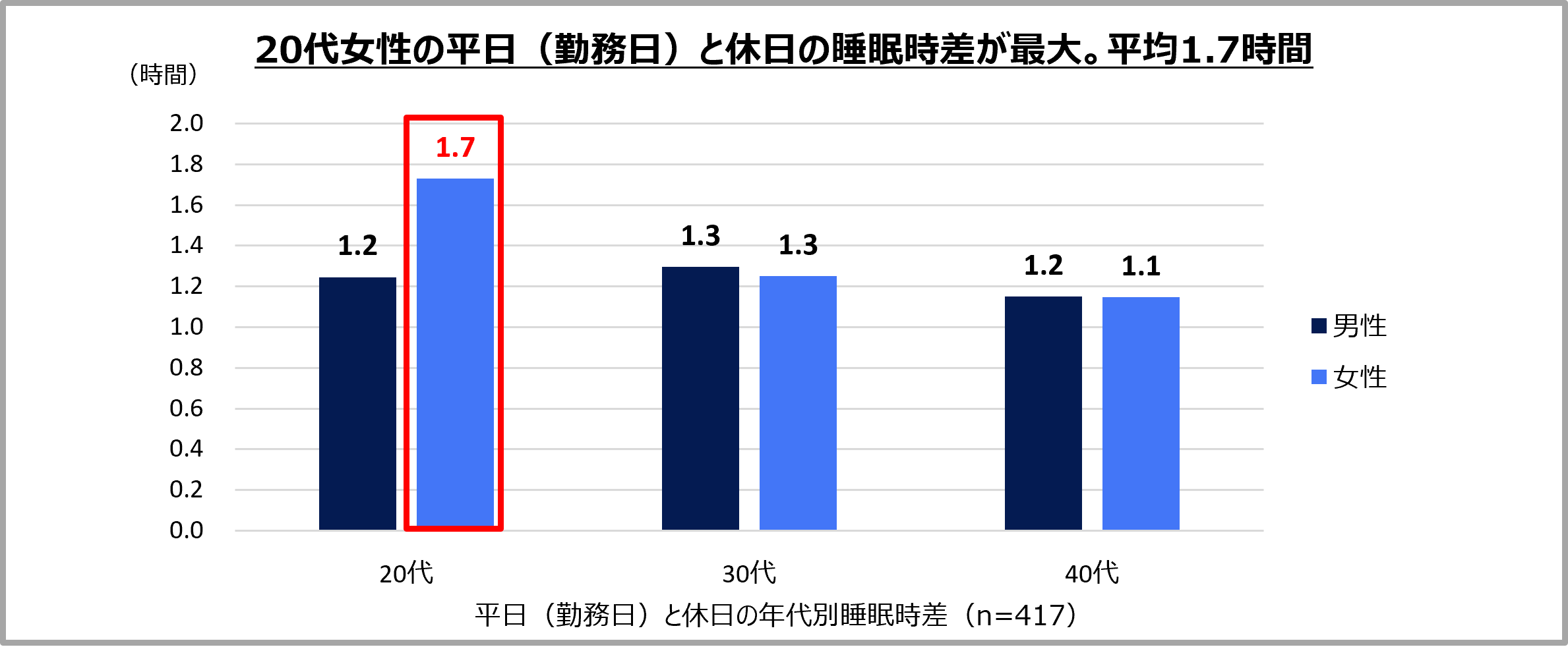 ●平日(勤務日)と休日の「睡眠時差」は、20代女性が最大、平均1.7時間のズレ。