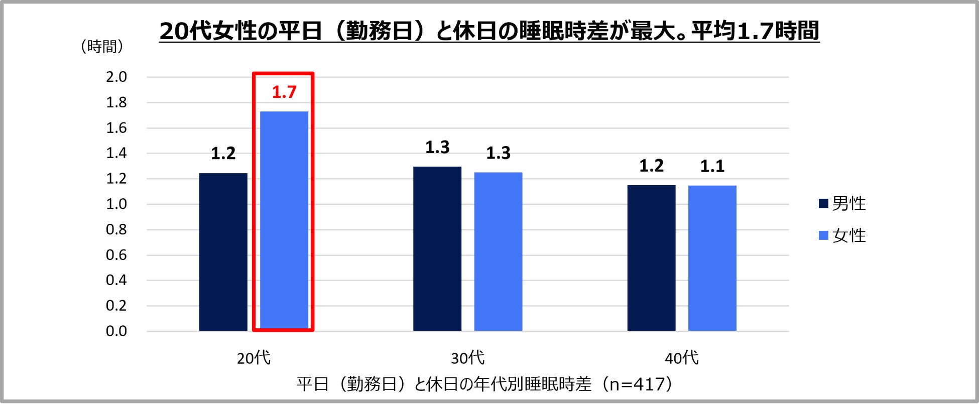 平日(勤務日)と休日の「睡眠時差」は、20代女性が最大、平均1.7時間のズレ。