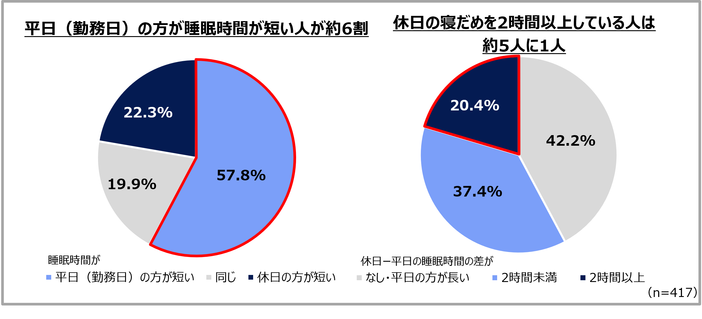 6割近くが、休日より平日(勤務日)の方が睡眠時間が短い。 約5人に1人が休日に「寝だめ」 。
