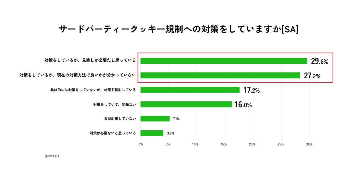 デジタルマーケティングを担当するマーケターに調査を実施したところ、サードパーティCookie規制への対策については、約56.8%が対策をしていても満足していないと回答。対策をしているが見直しが必要と思う人(29.6%)や対策方法が良いか分かっていない人(27.2%)が多いことが明らかになりました。