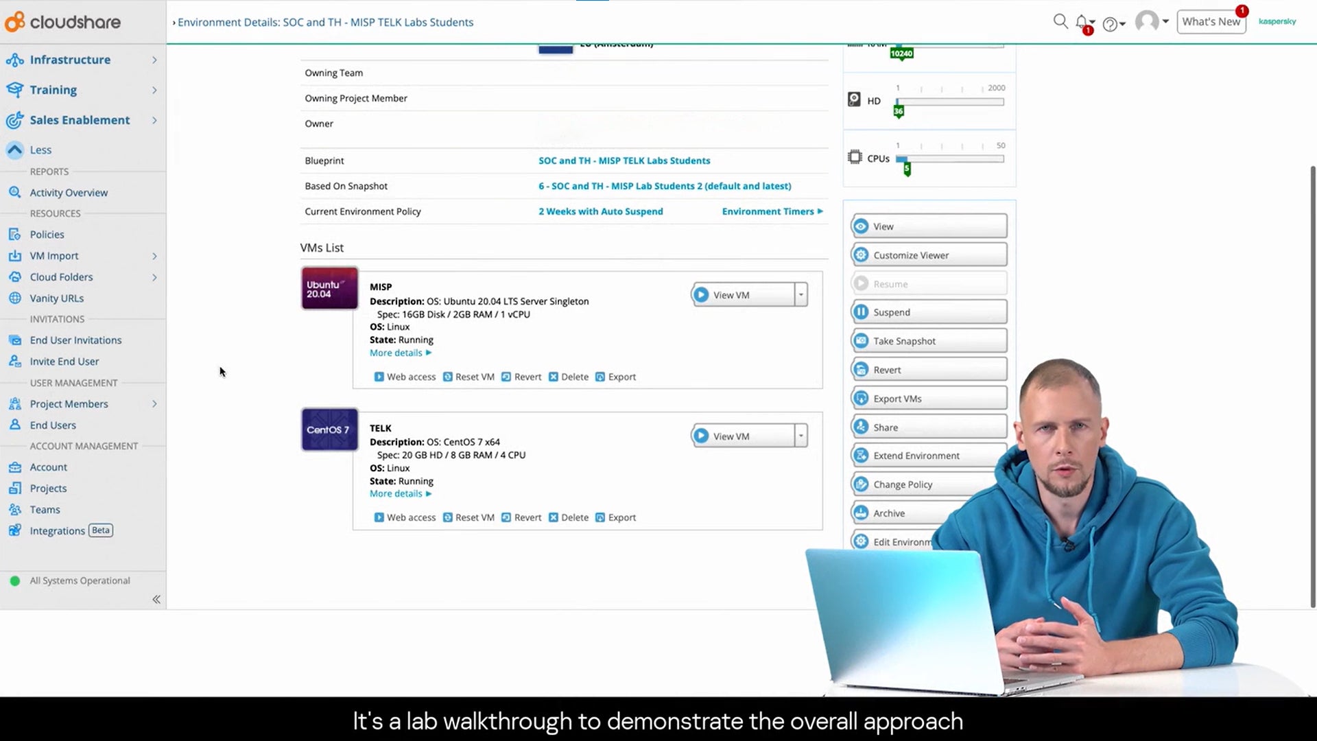 トレーニングには関連資料、オンデマンド形式の解説動画 (音声は英語、英語の字幕付き)、専用の仮想ラボ、演習問題が含まれます。契約期間中であれば、インターネット接続可能なパソコンやタブレットから受講者のペースで自由に受講できます。また、章ごとに用意されたクイズで内容を振り返ることで自身の理解度を把握することができるようになっており、不明な点は当社担当エキスパートへの直接の質問(英語)も受け付けています。各コースの解説動画を視聴するのにかかる所要時間はおおむね10~20時間です。