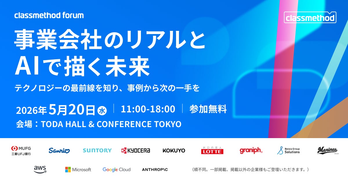 クラスメソッド株式会社(本社:東京都港区、代表取締役:横田聡)は、カンファレンス「Classmethod Forum【事業会社のリアルとAIの描く未来】」を、2026年5月20日(水)にTODA HALL & CONFERENCE TOKYOにて開催いたします。このイベントは、事業部門で技術活用の意思決定に携わる方や推進していく方を対象としています。