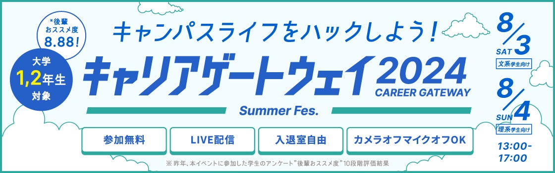 株式会社ベネッセホールディングスとパーソルキャリア株式会社の合弁会社:株式会社ベネッセ i-キャリア(本社:東京都新宿区、代表取締役社長:乾 史憲、以下 アイキャリア)が運営する、doda発の新卒オファーサービス「dodaキャンパス」は、新卒採用領域に関して課題意識を持つ企業14社とともに、大学1、2年生限定の大型イベント「キャリアゲートウェイ2024 Summer Fes. powered by dodaキャンパス」を8月3日(土)、4日(日)に開催します。尚、当イベントは3年連続3回目の開催となります。