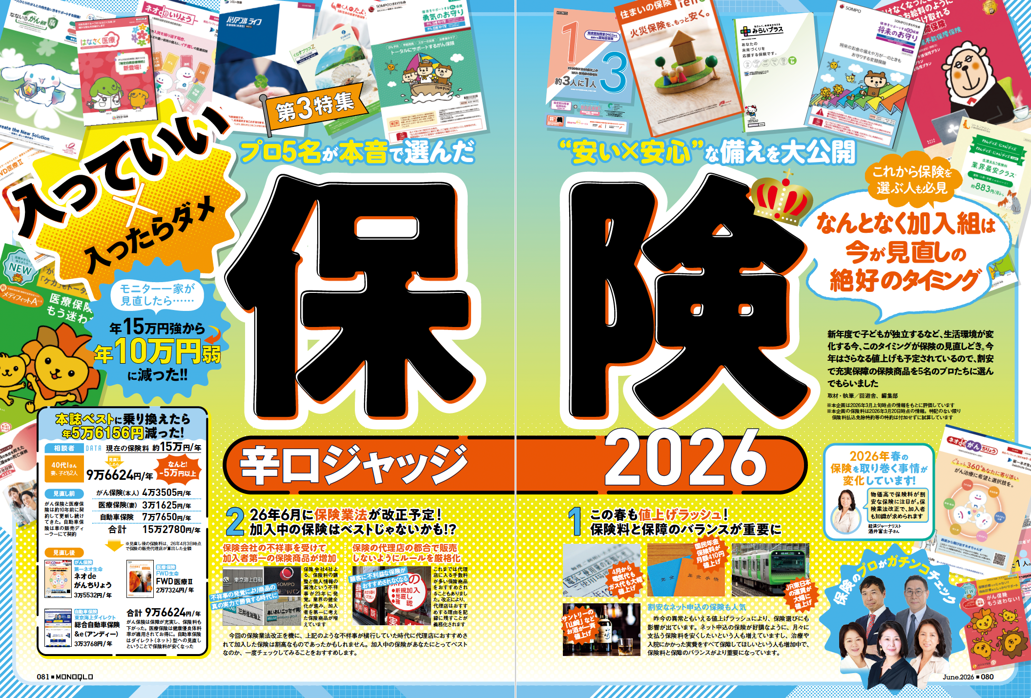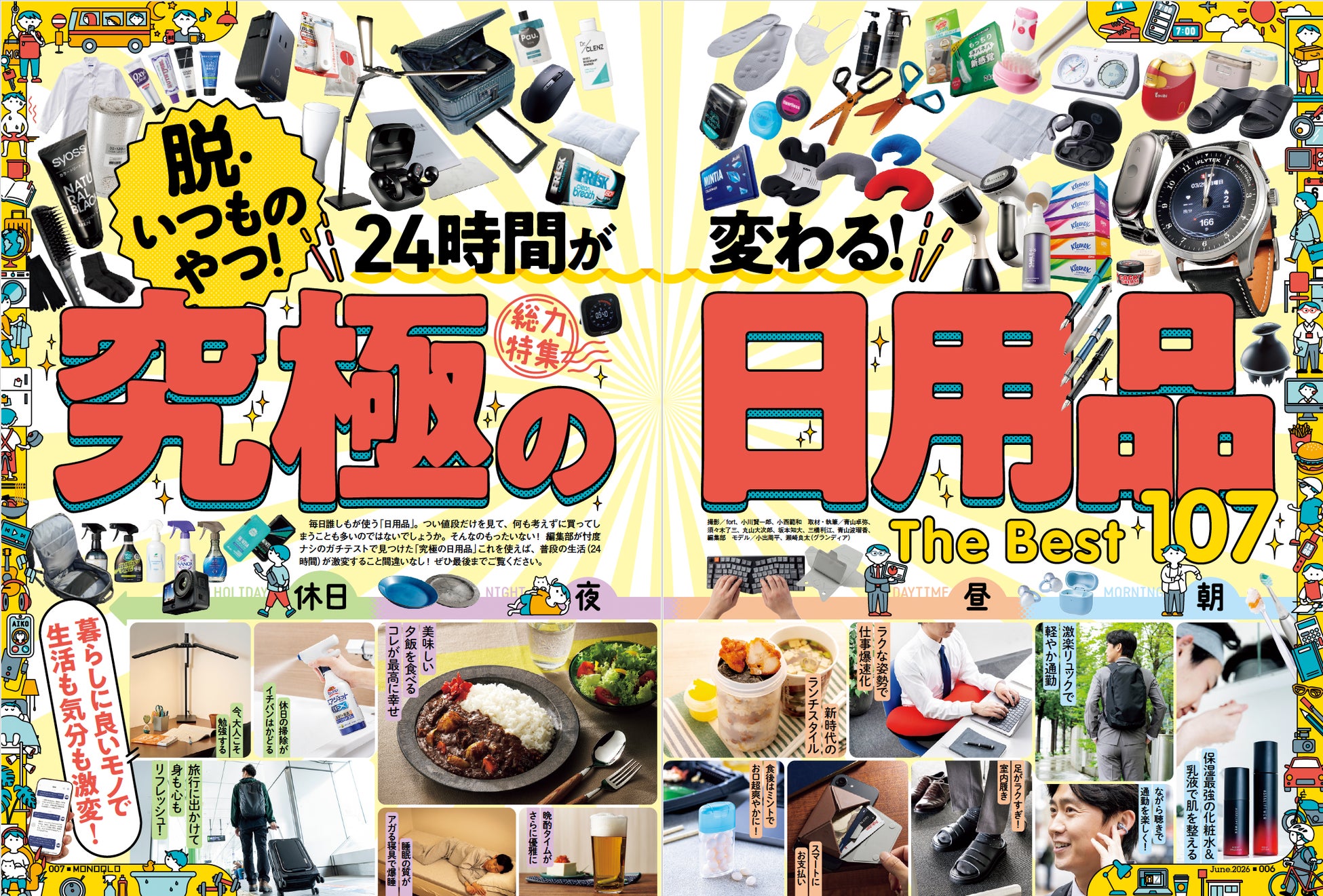 6月号は「究極の日用品The Best 2026」を総力特集! 朝・昼・夜・休日それぞれで使う日用品をくまなく調査して、おすすめを紹介します。「脱・いつものやつ」で24時間をアップデートしましょう! その他、「保険辛口ジャッジ」「英語コーチング覆面調査」なども掲載。6月号も暮らしをアップデートする情報を厳選してお届けします。