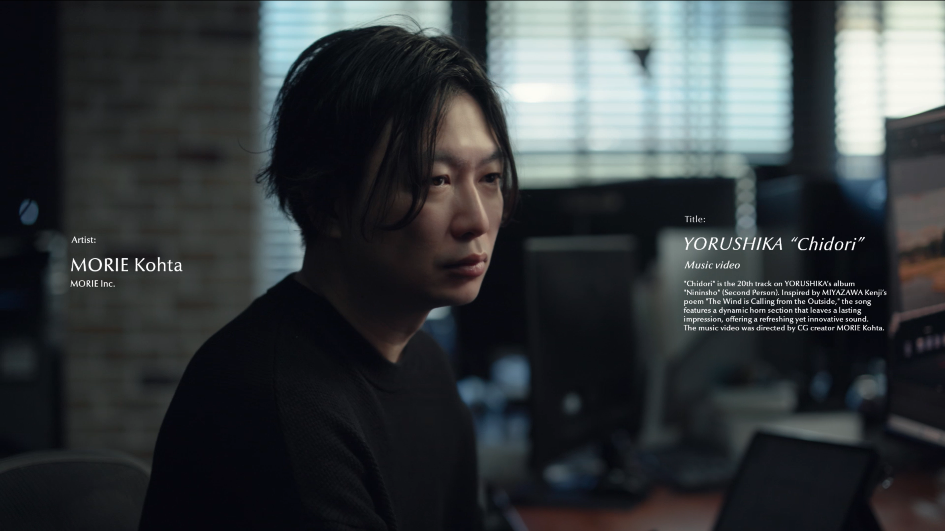 島根県松江市出身のCGクリエイター。2005年からCGアニメーターとして活動し、2016年に自身が代表を務めるMORIE Inc.を立ち上げる。現在はディレクター、CGアニメーター、映像作家など多岐に渡り活躍している。これまで手掛けた作品は、NHK連続テレビ小説『ひよっこ2』タイトルバック、NHKスペシャル『恐竜超世界』、映画ドラえもん『のび太の新恐竜』、GReeeeN MV『星影のエール』、YOASOBI MV『大正浪漫』、日清カップヌードルCM『HUNGRY DAYS ワンピース頂上騎馬戦篇』など。ヨルシカのMVは『ノーチラス』『春泥棒』『左右盲』『晴る』に続き、今回の『千鳥』が5本目の担当作品となる。