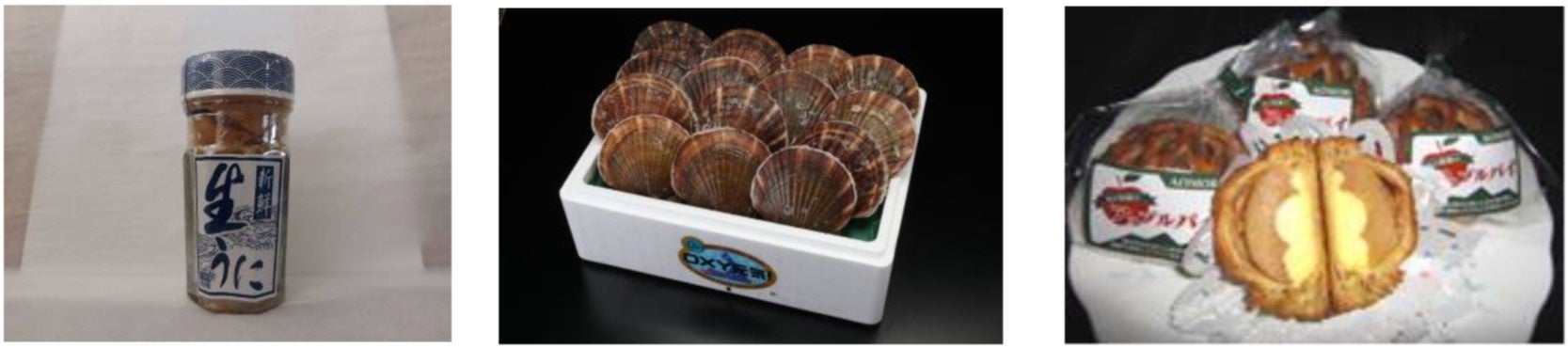 左・中央: 青森県漁連「陸奥湾の瓶入り生ウニ」「活きホタテ」(14、15日のみ販売、15:30頃販売開始)