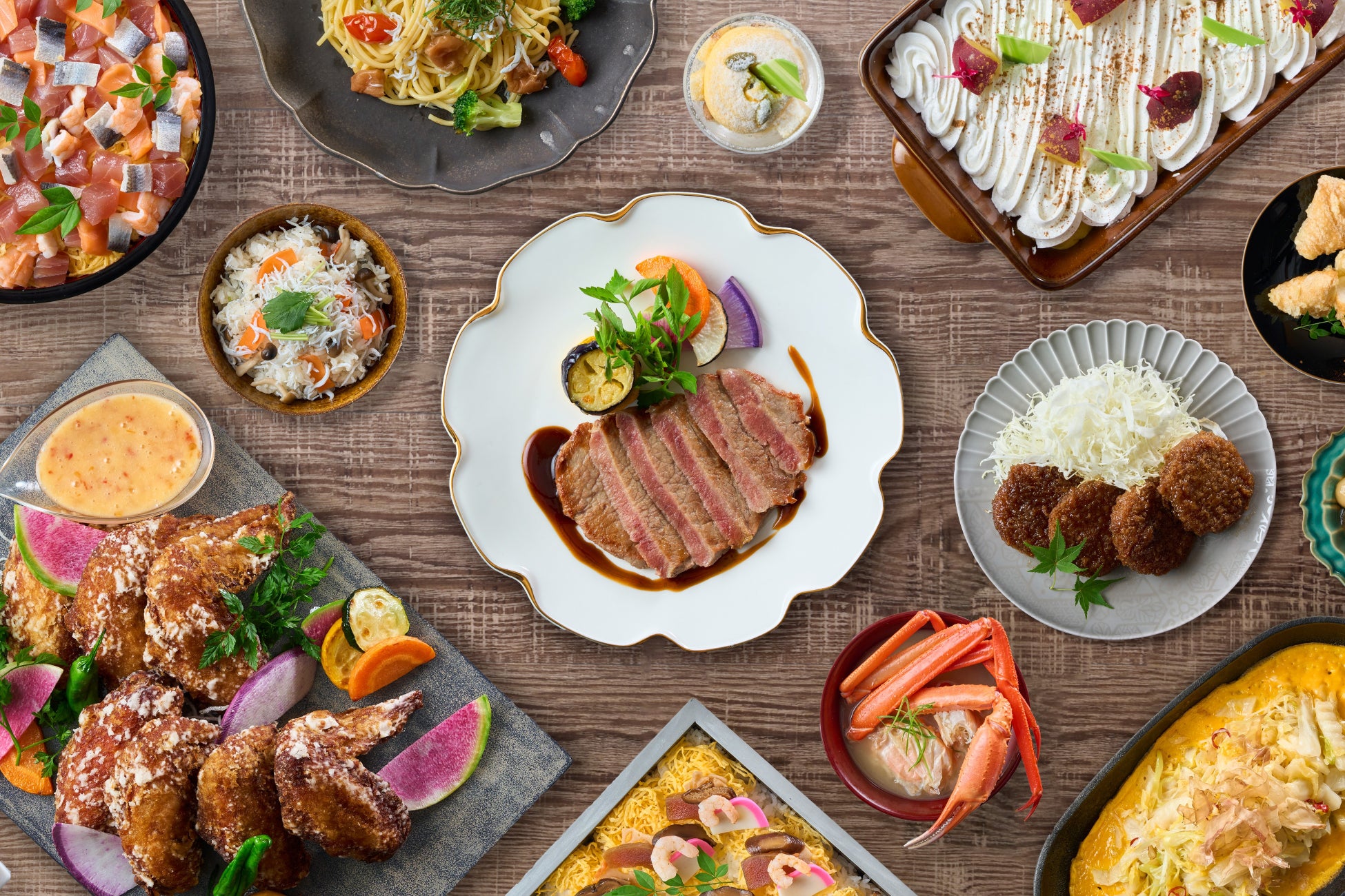 お食事は、季節を感じる創作メニューをご用意し、一年を通して様々な美味しさでおもてなしいたします。焼きたてのサーロインステーキ※やお造り、握り寿司といった定番メニューをはじめ、ご当地メニューのカニ押し寿司やめった汁、フェアメニューの博多もつ鍋、ハーゲンダッツ アイスクリームなど多彩なメニューをお楽しみください。