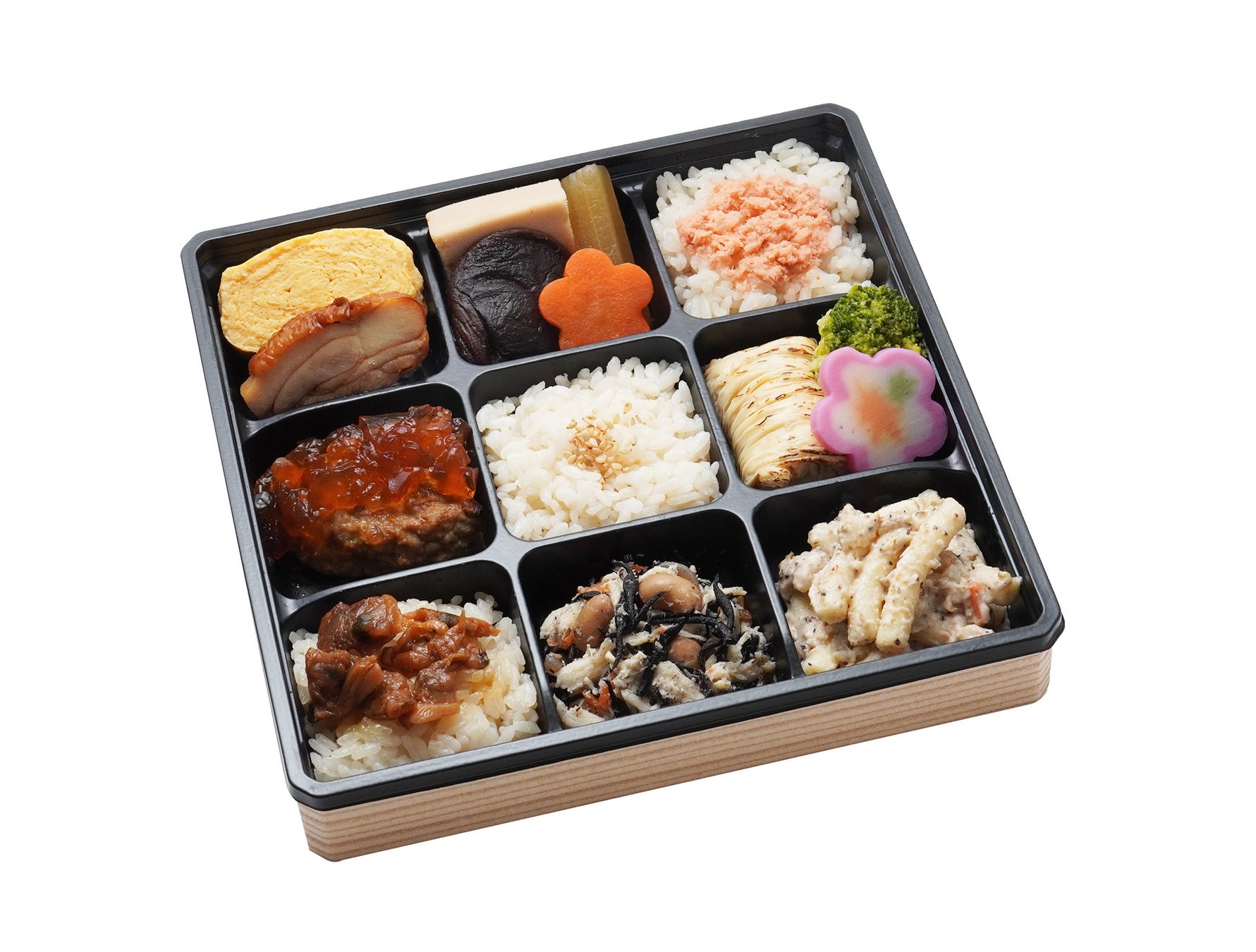 おだしがきいた様々なおかずと、鮭やあさりの佃煮、炒りごまを乗せただし炊き込みご飯を彩り豊かに詰め合せたお弁当です。ぽん酢ジュレがけのハンバーグや粗挽き胡椒のマカロニサラダなど、冬季限定のお惣菜もお楽しみいただけます。