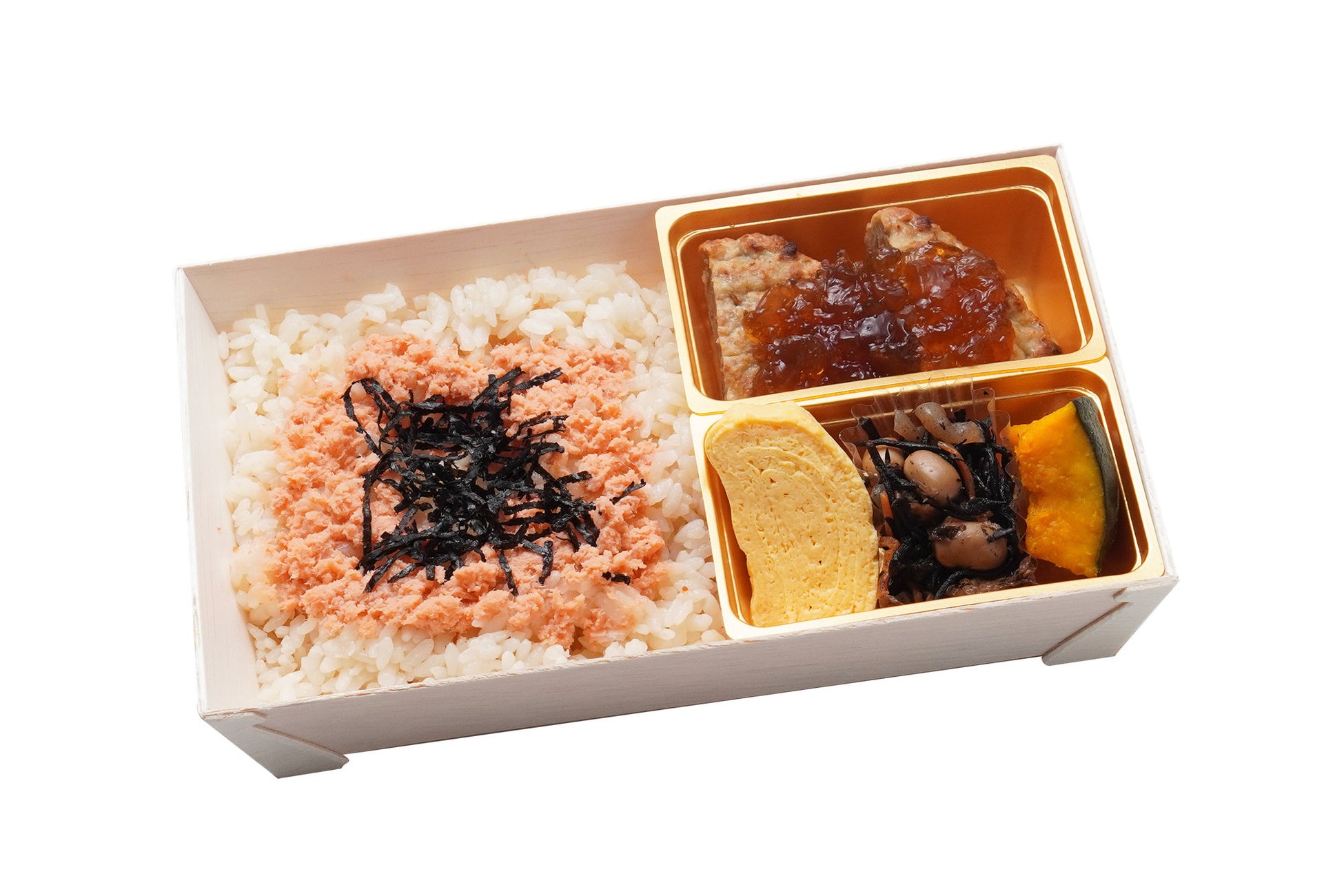 鮭を乗せただし炊き込みご飯に、ぽん酢ジュレで爽やかに仕上げたハンバーグやだしをきかせたおかずを詰め合せた冬限定のお弁当です。