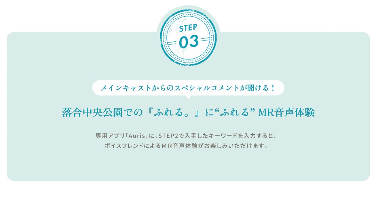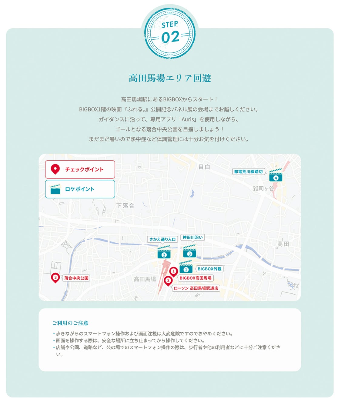 本企画では、参加者のスマートフォンへ「Auris」をダウンロードいただき、映画の舞台となった高田馬場エリア内に設定されたチェックポイントを周遊していただきます。チェックポイントは、9月1日(日)より映画のパネル展を実施中の「BIGBOX高田馬場」、映画とのコラボ企画を実施中の「ローソン 高田馬場駅通店」、映画の重要なシーンで登場する「落合中央公園」の3か所です。ゴール地点となる「落合中央公園」では、臨場感のあるMR音声体験をすることができ、主演の永瀬廉さんや坂東龍汰さん、前田拳太郎さんによる録り下ろしキャストコメントも聴くことが可能です。