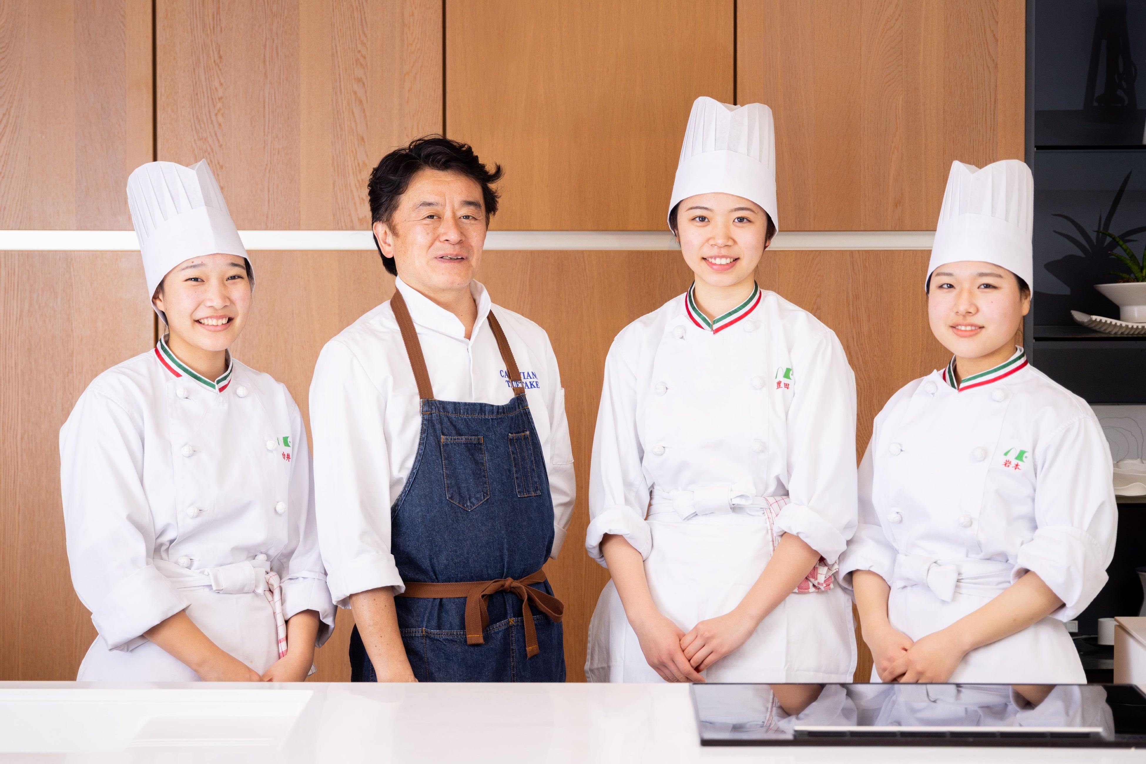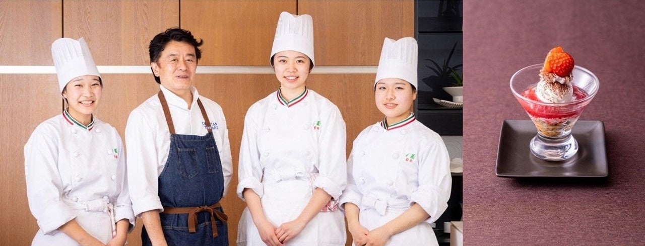 カノビアーノ植竹隆政シェフと野田鎌田学園高等専修学校(千葉県)「Soleil(ソレイユ)」の豐田結莉さん、白井柚花さん、岩本実優さん/ミガキイチゴとマスカルポーネアイスのティラミス