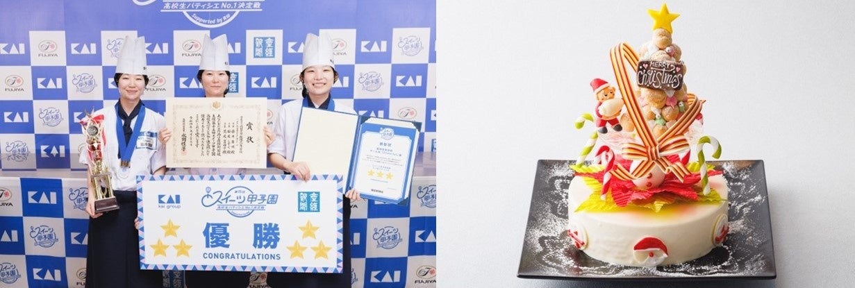 「第15回スイーツ甲子園」優勝チームの飯塚高等学校「Cheerful(チアフル)」のメンバー3人=写真左=と作品「Noel blanc(ノエル ブラン)」