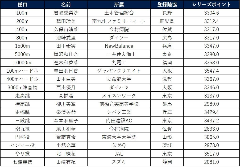 女子種目別チャンピオン一覧
