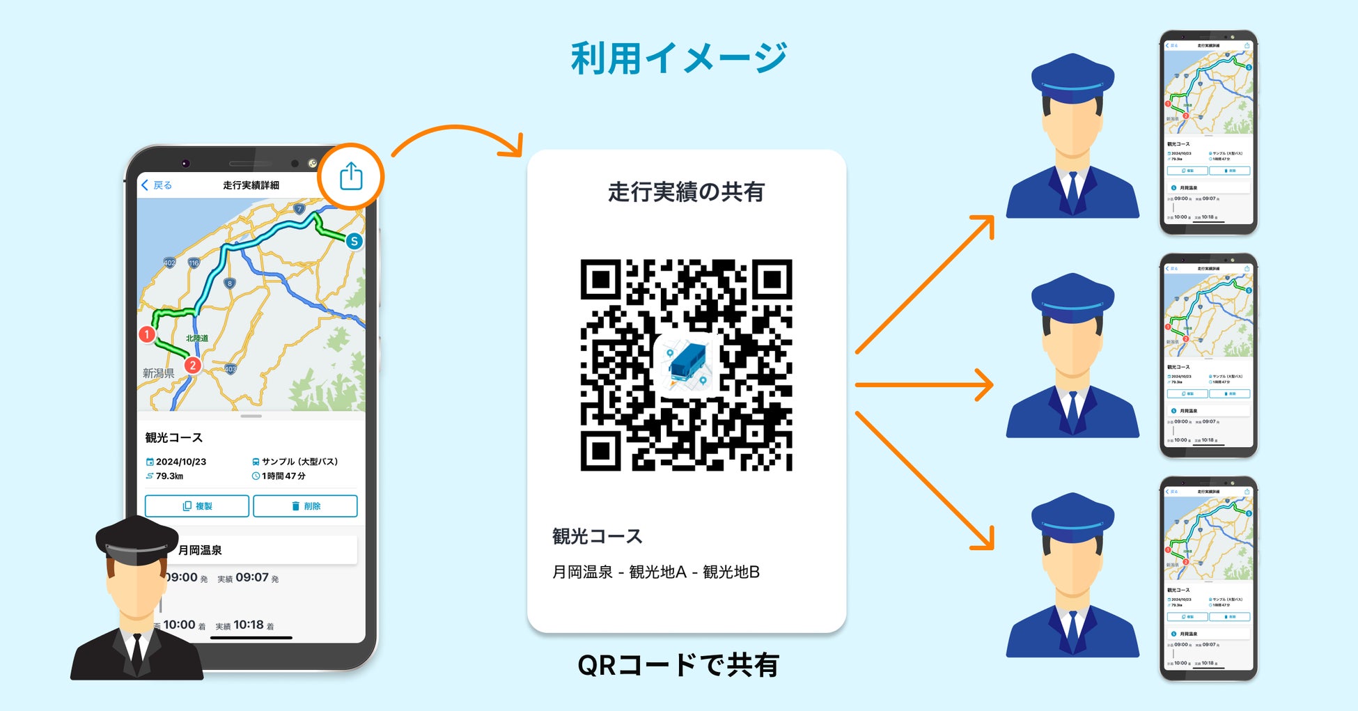 また複数のバスで同じ目的地に向かう梯団走行や、他のバス事業者と合同運行の場合でも、QRコードを介する共有なので、催行当日にドライバー間で連携することも容易で、スムーズな事前打ち合わや運行をサポートできればと思います。