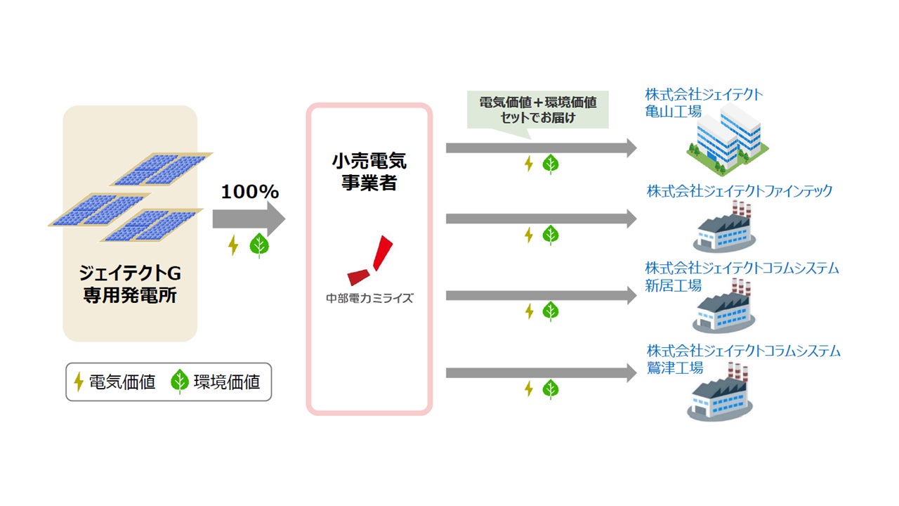 株式会社ジェイテクト(本社:愛知県刈谷市、取締役社長:近藤 禎人、以下「ジェイテクト」)は、グループ会社の株式会社ジェイテクトコラムシステム(本社:静岡県湖西市、代表取締役社長:秋山 式広)、株式会社ジェイテクトファインテック(本社:栃木県宇都宮市、代表取締役社長:印南 達也)と共に、中部電力ミライズ株式会社(本社:愛知県名古屋市、代表取締役:神谷 泰範、以下「中部電力ミライズ」)と、当社亀山工場(三重県亀山市)、ジェイテクトファインテック伊賀工場(三重県伊賀市)、ジェイテクトコラムシステム本社・テクニカルセンターおよび新居工場(静岡県湖西市)への専用の太陽光発電所を活用したオフサイトPPAサービス(注1)(以下「本サービス」)の契約を締結し、10月1日より電力の調達を開始しました。