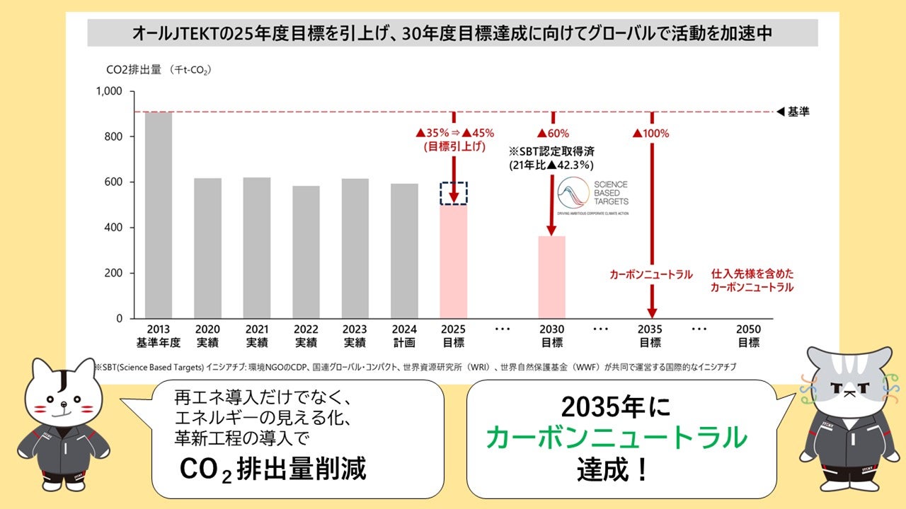 ジェイテクトは、「環境チャレンジ2050」を策定し「All for One Earth」をスローガンに、かけがえのない地球を次世代につなぐためのチャレンジをし続けています。カーボンニュートラル達成のためにSCOPE1、2、3すべてにおいてCO2排出量削減をすすめ、自社の生産活動に関連するスコープ1、2においては2035年にカーボンニュートラル達成を目指しています。