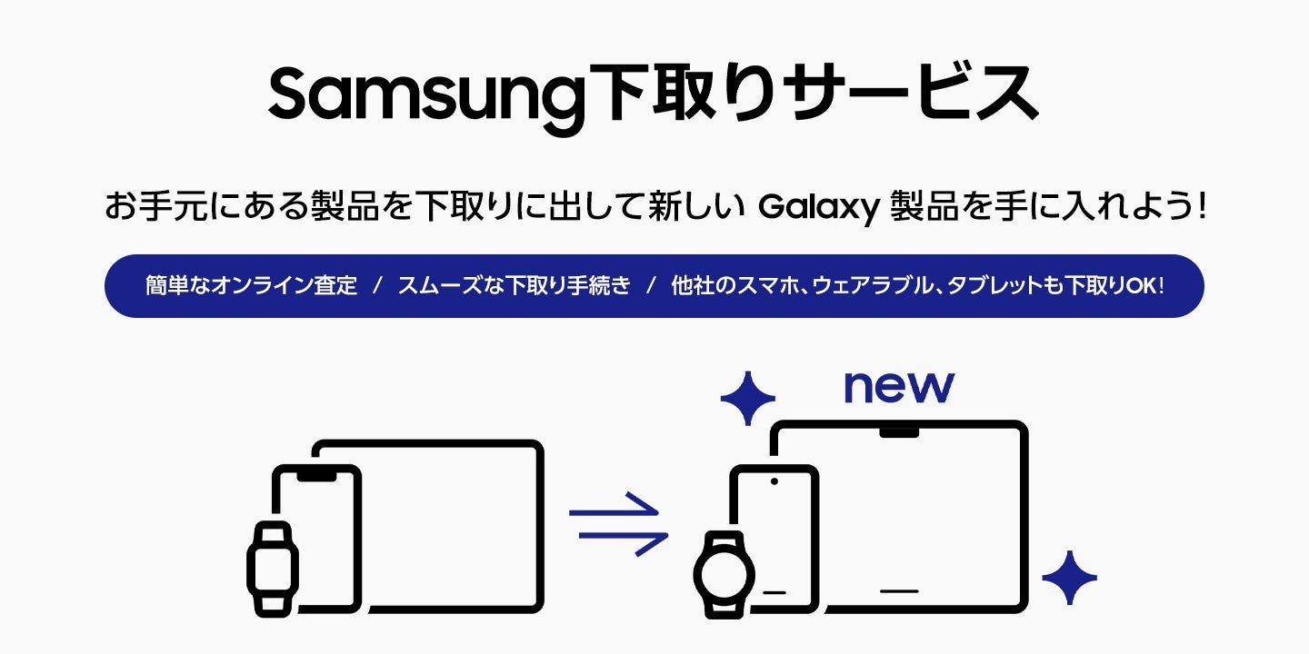 ※Samsung下取りサービスは、新製品の購入1台に対して1台までの受付け、同じ種類のアイテム同士のみ下取り可能となります。(例:スマートフォン購入時はスマートフォンの下取りのみ可能)