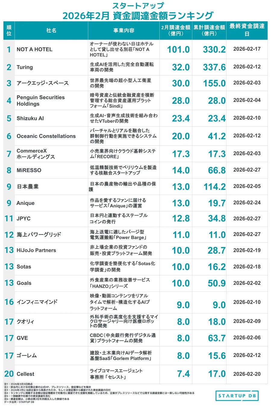 1位はシェア別荘兼ホテルを運営するNOT A HOTELで、101億円を調達しました。