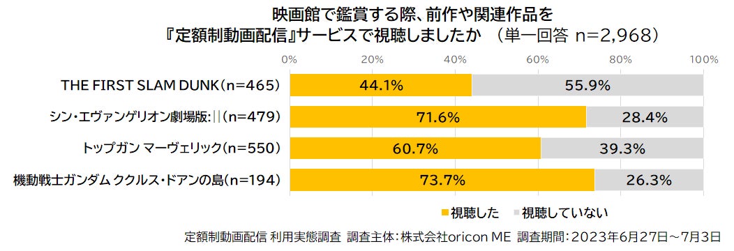 各タイトルの映画を鑑賞した回答者に「映画館での鑑賞に向けて、映画の前作や関連作品を『定額制動画配信』サービスで視聴したか」について聴取したところ、視聴した人は『THE FIRST SLAM DUNK』では44.1%、『シン・エヴァンゲリオン劇場版:❘❘』では71.6%、『トップガン マーヴェリック』では60.7%、『機動戦士ガンダム ククルス・ドアンの島』では73.7%となりました。