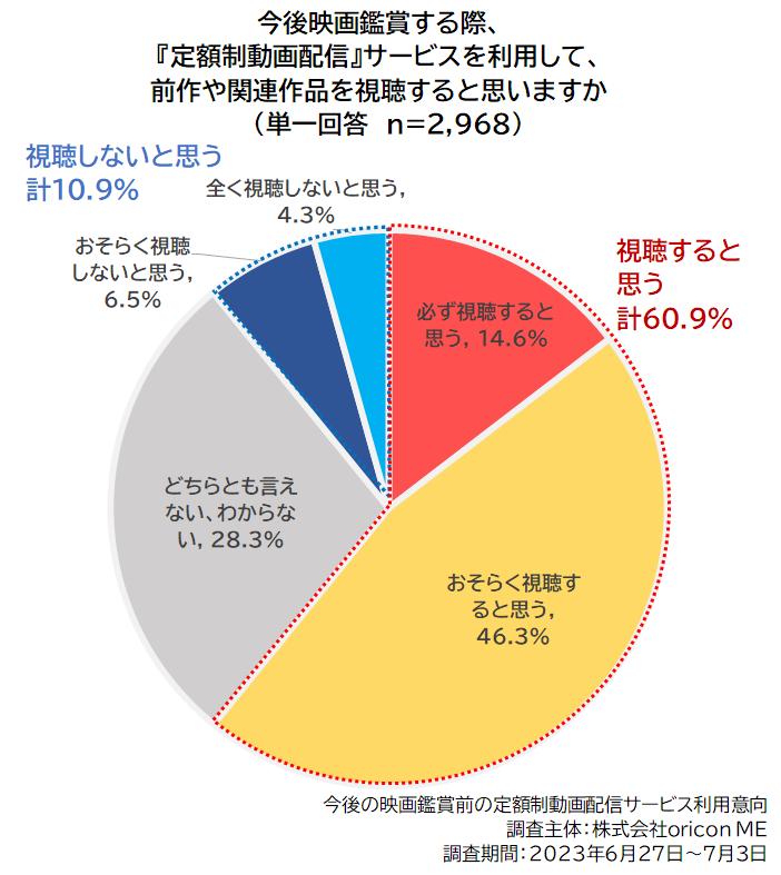 また、2023年の全回答者に「今後公開される映画を鑑賞する際、『定額制動画配信』サービスを利用して、前作や関連作品を視聴するかどうか」について聴取したところ、「視聴すると思う」と回答した人は計60.9%となりました。一方、「視聴しないと思う」の計は10.9%、「どちらとも言えない、わからない」は28.3%でした。