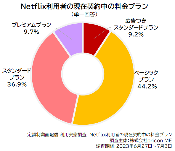 【Netflix】が2022年11月から新たに低価格帯のプランの提供を開始したことを受けて、2023年調査で【Netflix】の利用者を対象に、現在契約している料金プランについて聴取したところ、「広告つきスタンダードプラン(月額790円)」は9.2%、「ベーシックプラン(月額990円)」は44.2%、「スタンダードプラン(月額1,490円)」は36.9%、「プレミアムプラン(月額1,980円)」は9.7%となりました。