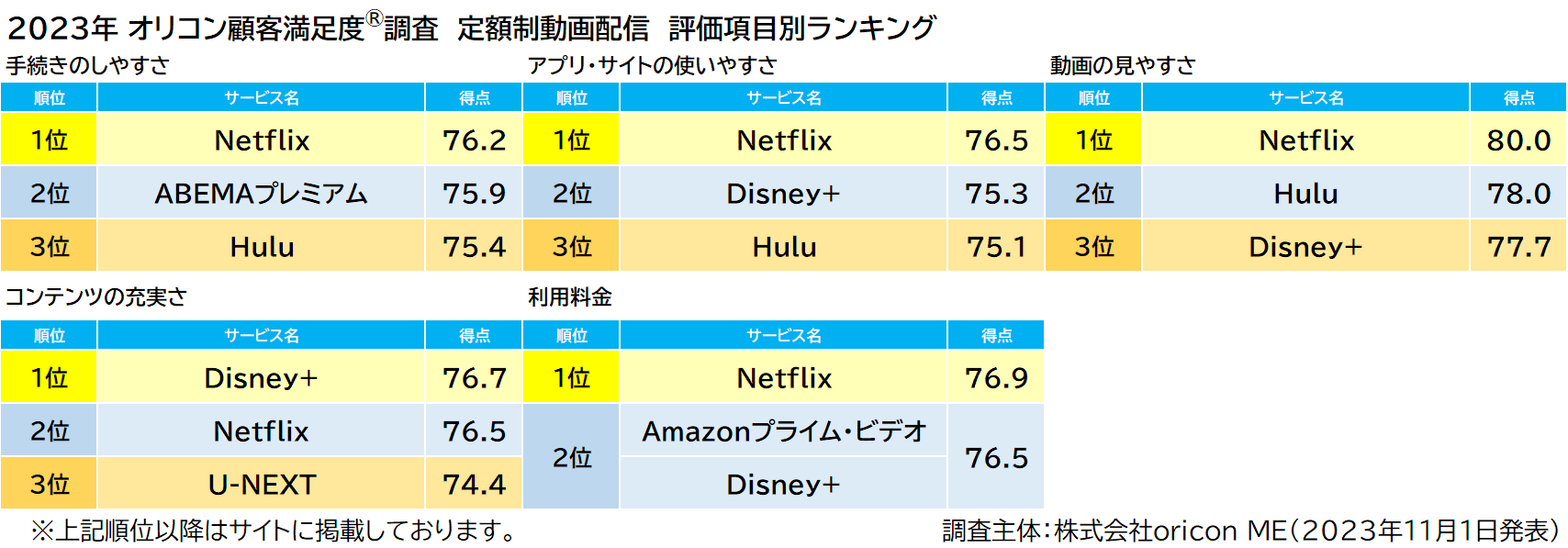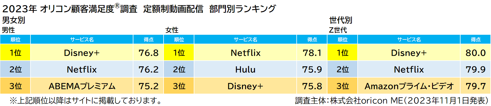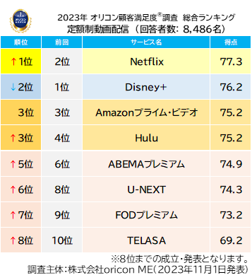 2023年 満足度の高い『定額制動画配信』ランキング|【Netflix(ネットフリックス)】が3年ぶり5度目の総合1位(オリコン顧客満足度調査)
