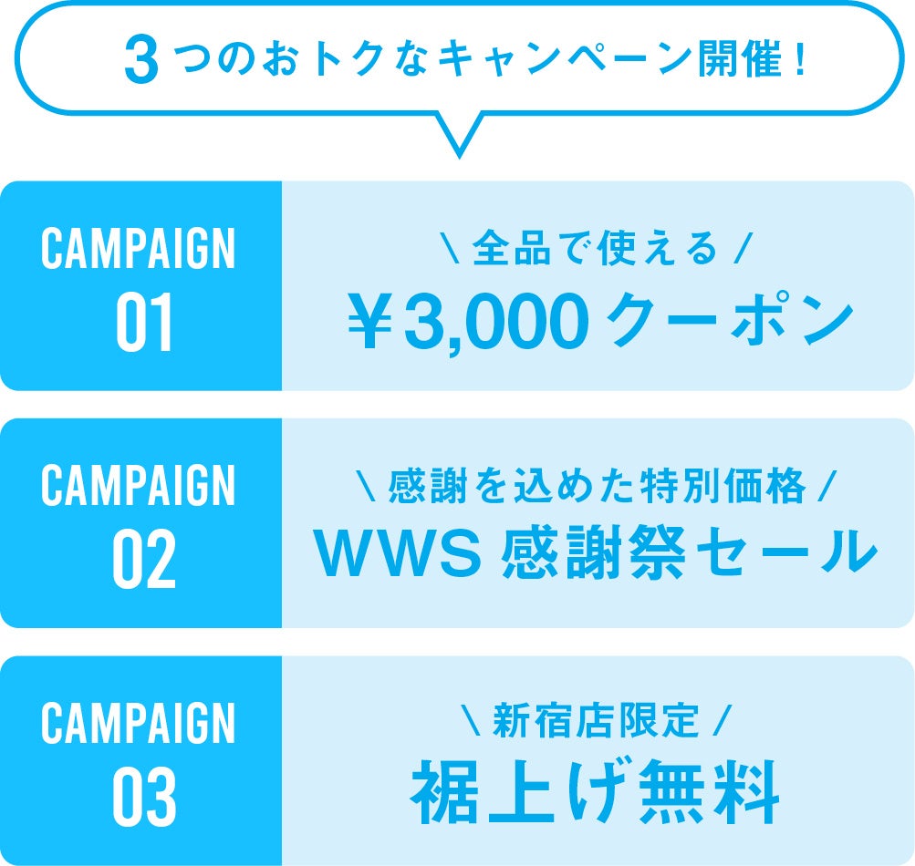 期間中にWWS公式オンラインストア・WWS公式ストアで使用できる3000円OFFクーポンプレゼント。さらに、一部商品を特別価格にて販売します。また、WWS Flagship Store新宿店限定でパンツをご購入の方に、通常1,320円の裾上げ加工を無料で実施いたします。