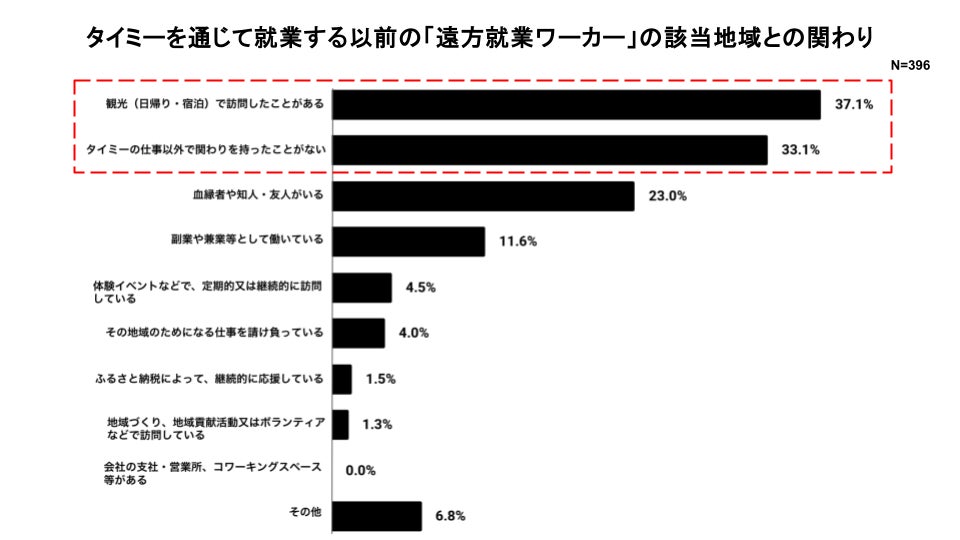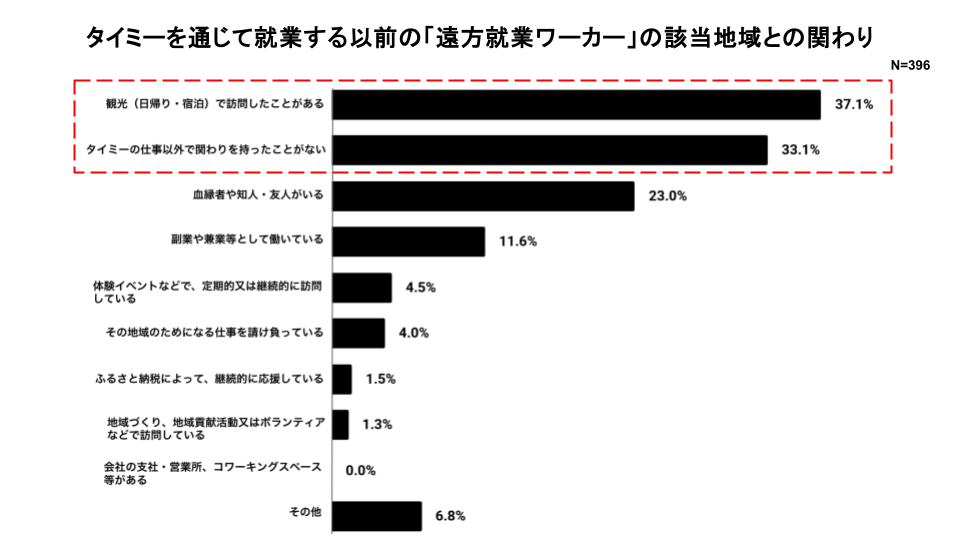 ■「遠方就業ワーカー」の内、働く以前には当該地域と関わりを持っていなかった層は33.1%。タイミーを通じた就業が「接点のなかった地域との出会い」のきっかけに