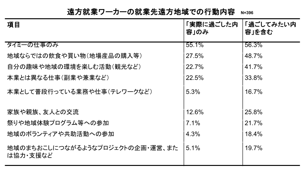 「実際に過ごした内容」に「潜在的意欲(過ごしてみたい内容)」を含めて分析すると、「余暇活動中心型」と「地方関心型」を合わせた割合は、実績の45.0%から78.6%へと大幅に上昇し、「遠方就業ワーカー」の約8割が地域活動や経済活動への意向を有していることが明らかになりました。