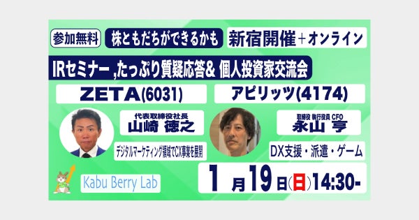 2025年1月19日(日)に開催される個人投資家向けIRセミナー「Kabu Berry Lab」に代表取締役社長の山崎が登壇し、ZETAのIR情報を読み解く上でのポイントについて詳しく解説いたします。