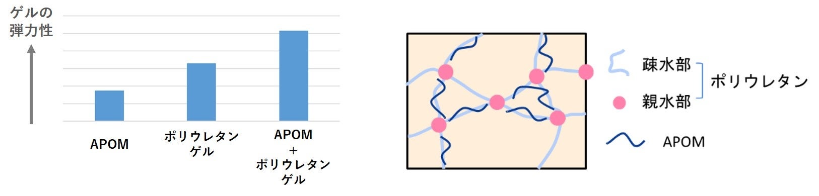 APOMは透明性、密着性、均一な膜形成に優れており、結晶性を持たないため、高配合により強度を高めても、透明性を維持できる特長をもっています。また、ポリウレタンは油剤を含むことで動きに追従するような柔軟なゲルを形成することができます。そこで、まずはこれらを組み合わせることで目もとの動きにも耐えられる柔軟なゲルの作製を検討しました。その結果、両者を特定の比率で共存させることで、それぞれを単独でゲル化したときよりも高い弾力を持つ複合ゲルを形成できることを見出しました(図2)。これはポリウレタンの構造内の疎水部分(水を弾く部分)にAPOMが密着することで補強されたためと考えられます(図3)。
