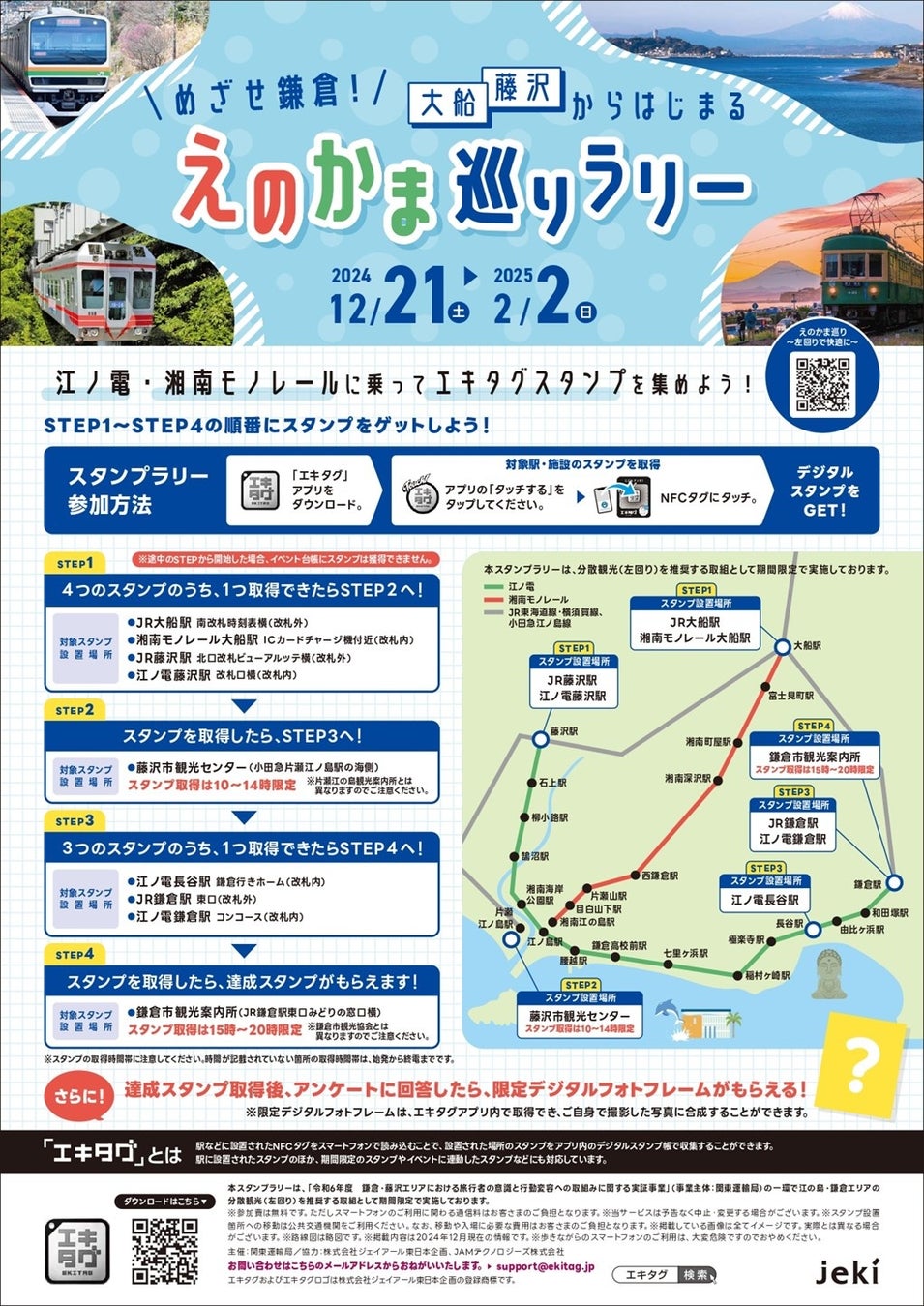 ◎株式会社ジェイアール東日本企画が提供する駅スタンプアプリ「エキタグ」では2024年12月21日(土)より\めざせ鎌倉!/大船・藤沢からはじまる「えのかま巡りラリー」が開催されます!