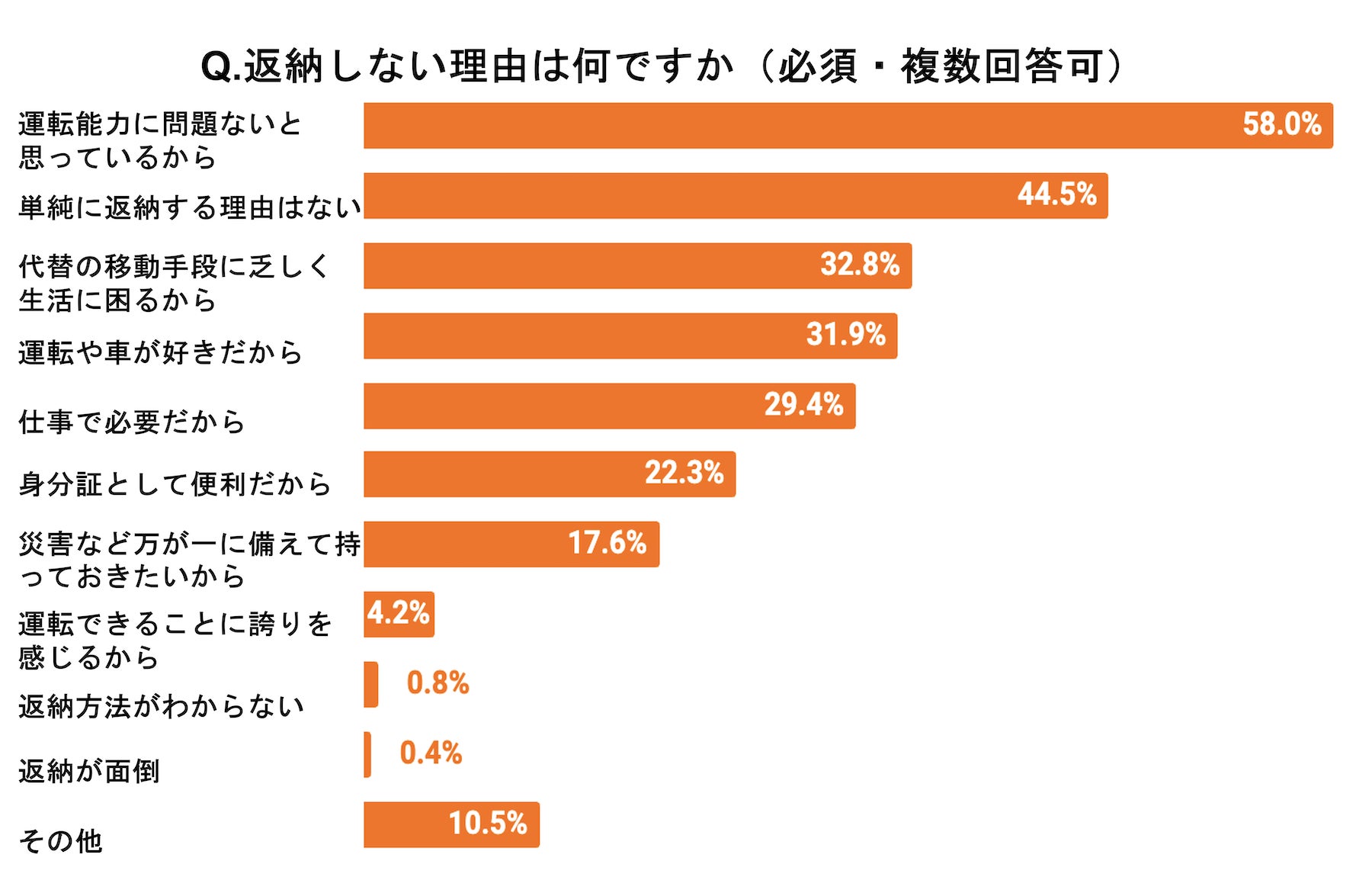 「返納していない(返納予定なし)」と回答した人に、返納しない理由を尋ねたところ、「運転能力に問題ないと思っているから」が58.0%で最多となりました。その他の回答として「代替の移動手段に乏しく生活に困るから」が32.8%、「運転や車が好きだから」が31.9%と上位となりました。