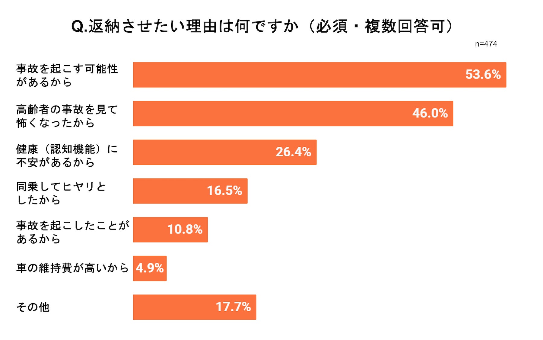 「免許を持っている70歳以上の親・祖父母のうち、返納した人も返納していない人もいる」、「免許を持っている70歳以上の親・祖父母が誰も返納していない」と回答した人を対象に、返納させたいか否かに関わらず、返納させたいとした場合の理由について尋ねると、「事故を起こす可能性があるから」が53.6%、「高齢者の事故を見て怖くなったから」が46.0%と続き、家族が事故にあってしまうことを不安視する声が目立ちました。