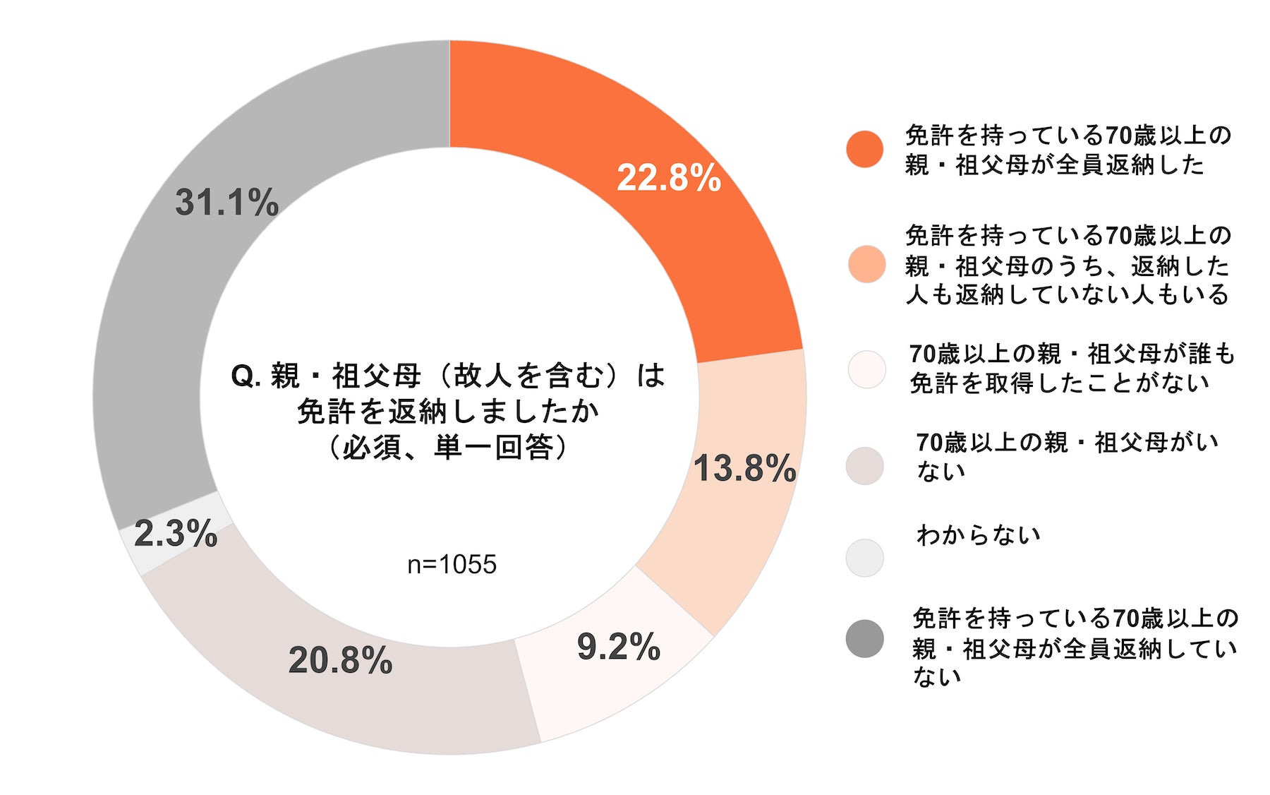 回答者本人ではなく、回答者の70歳以上の親・祖父母(故人を含む)の返納状況についても尋ねました。「免許を持っている70歳以上の親・祖父母が全員返納した」が22.8%、「免許を持っている70歳以上の親・祖父母のうち、返納した人も返納していない人もいる」が13.8%となりました。一方、「免許を持っている70歳以上の親・祖父母が誰も返納していない」との回答は31.1%でした。