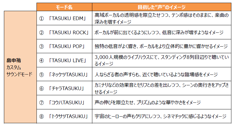 1.畠中祐氏の“声”に特化してチューニングした、全8種類のカスタムサウンドモード