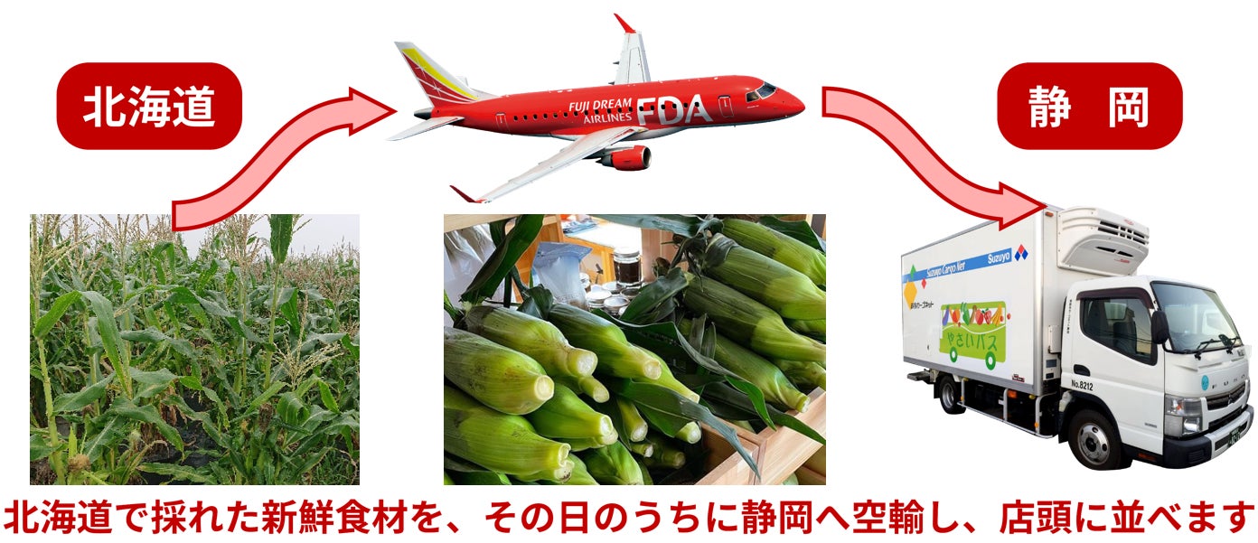 本プロジェクトでは、北海道内の産地や空港までの物流をやさいバス北海道が担い、新千歳空港より静岡空港までFDAの定期路線便を活用しお届けします。その後、静岡空港からは、再度やさいバス静岡が配送を担い、マックスバリュ東海の店舗に直接配送し、消費者のみなさまに新鮮な北海道の幸をお届けいたします。今回の取り組みでは通常、店頭まで2~4日程度かかる物流を、当日に店舗までお届けすることが可能となります。また鮮度感だけでなく、食材のもつ情報、人と人との関わり等を静岡県内の皆様にお届けすることで、産地と消費地双方の活性化につなげていく考えです。