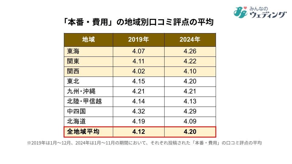 結婚式を実施した人による「本番」の「費用」に関する口コミデータについて、コロナ禍前の2019年とコロナ禍後の2024年を比較したところ、口コミ評点の全地域平均は、2019年の「4.12」から2024年は「4.20」に上昇していました。地域別では、全国でも結婚式・披露宴の開催数が多い関東・関西・東海エリアにおける上昇が顕著でした。