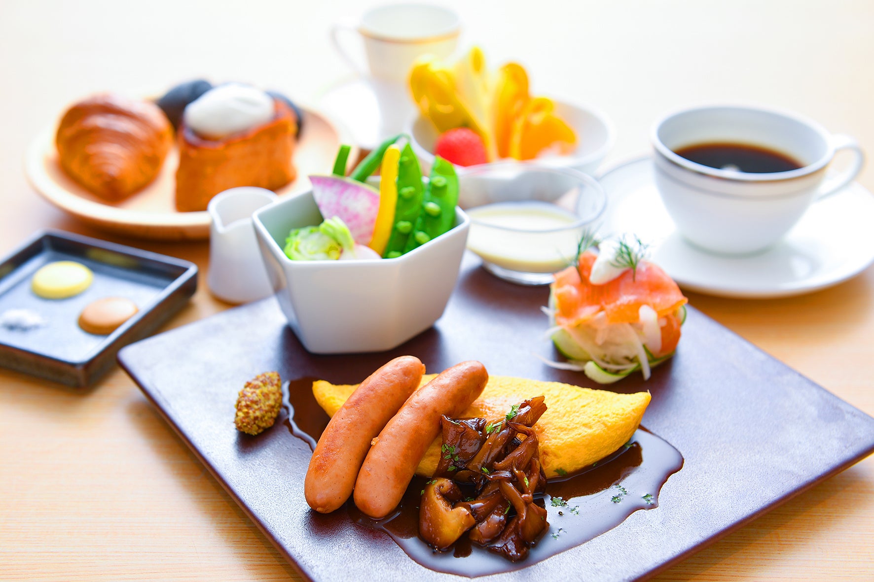 洋食では、出来立てのオムレツや神戸ポークのウインナー、野菜を使用したキッシュなどを提供します。