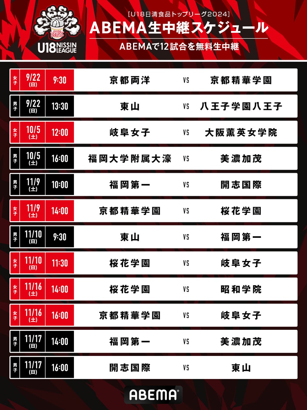 ■『U18日清食品トップリーグ2024』 ABEMA中継概要