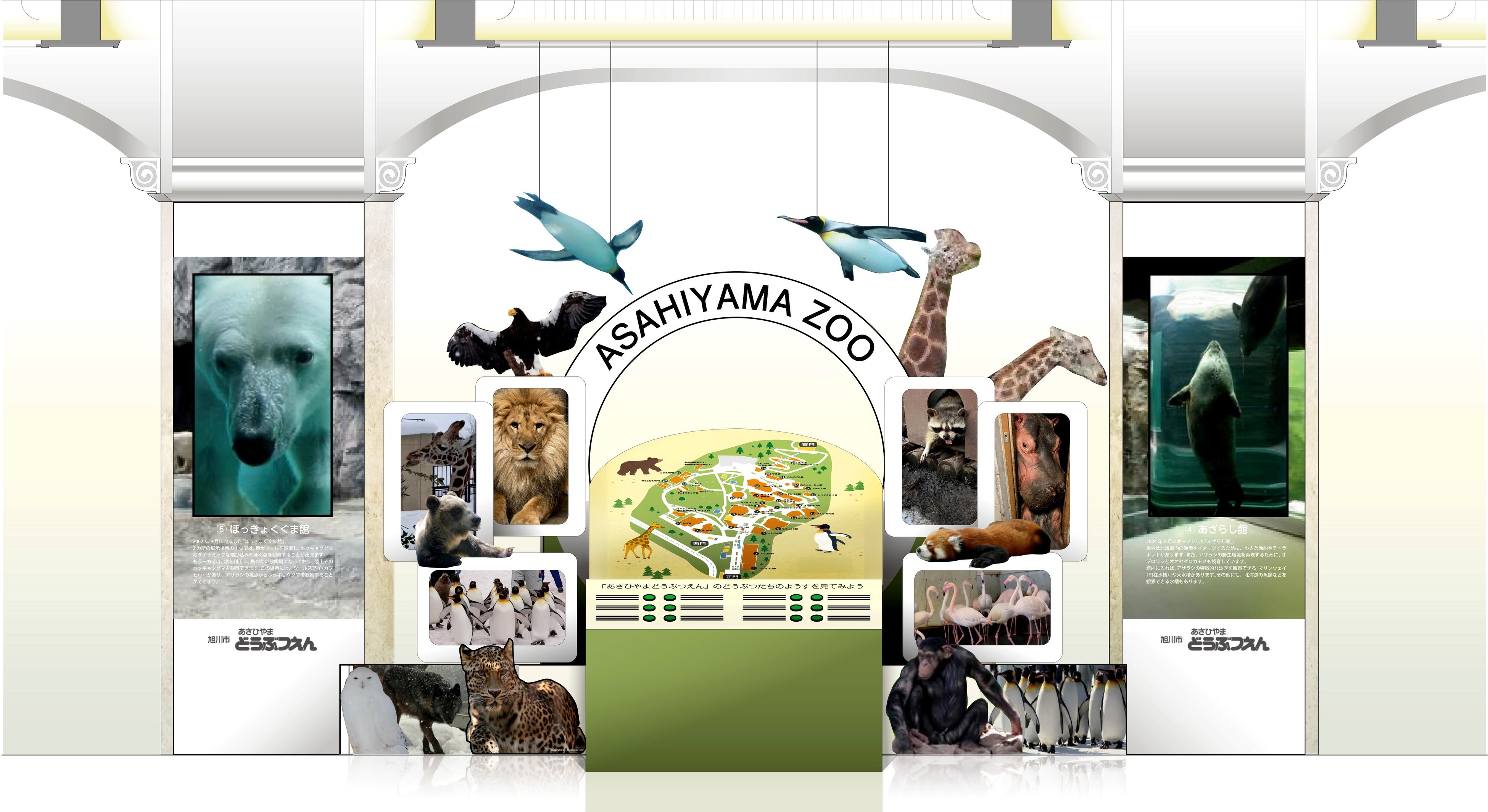 正面の入口を入るとすぐに見えてくるステージに旭山動物園で暮らす動物たちのパネルや映像が登場します。