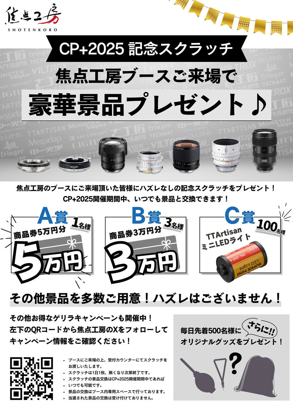 CP+2025記念スクラッチ! ハズレなし、その場で景品が確認できるスクラッチを全日程に渡ってプレゼント。その他 E&I(2ndfocus)からラッピングクロス100名様、K&F Conceptからカメラバッグなど、 皆様に何かしらの景品が当たる空くじなしの企画です。