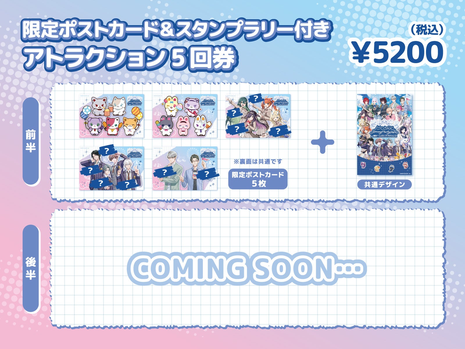 ※アトラクション5回券の限定ポストカードはキービジュアルデザイン(1枚)と、前後半の各期間に登場する各ユニットごとの集合デザイン(前半5枚・後半5枚)の合計6枚です。複製手書きメッセージが入ります(にじたうん・わんにゃくしょんを除く)。