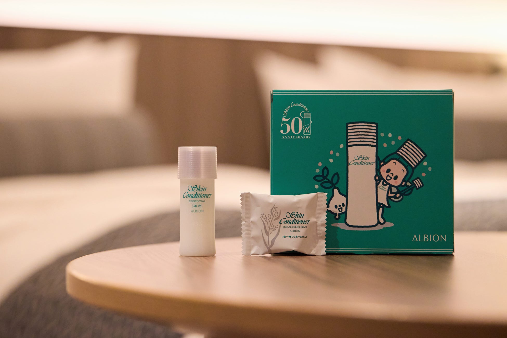 これは同社人気NO.1化粧水で、誕生50周年を迎えたロングセラー化粧水「スキンコンディショナー エッセンシャル(通称:スキコン)」と「クレンジングバー<メイク落とし・洗顔石鹸>」を体験いただける企画で、同ブランドの世界観に浸る宿泊体験をご提案するものです。なお、姉妹施設の京都センチュリーホテルのオーセンティックなバー「メインバー Essex(エセックス)」では同ブランドをイメージしたカクテル2種を期間限定でご用意します。
