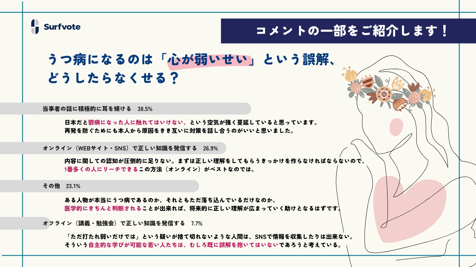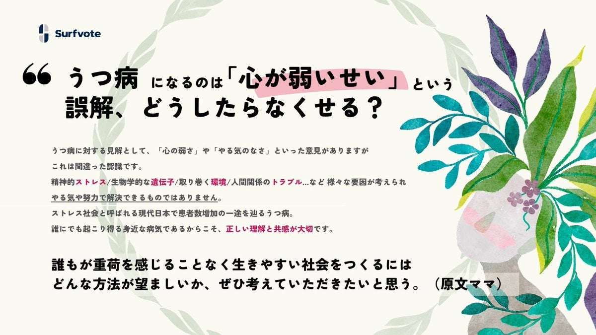【うつ病になるのは「心が弱いせい」という誤解、どうしたらなくせる?】Surfvoteで意見を募集しました