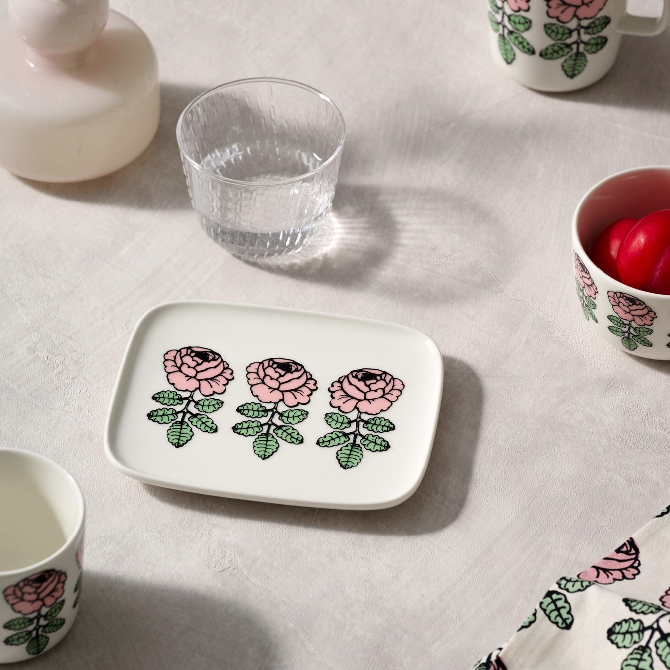 日本限定となる本コレクションには、2012年のコレクションで展開されたベビーピンクとミントグリーンで彩色したヴィヒキルースが復刻で採用されています。2012年当時のコレクションで展開された2dl コーヒーカップセットに加え、2.5dl マグカップやスクエアプレートなど、テーブルウェア4型、エプロンやポーチなどのファブリックアイテム3型をラインナップします。